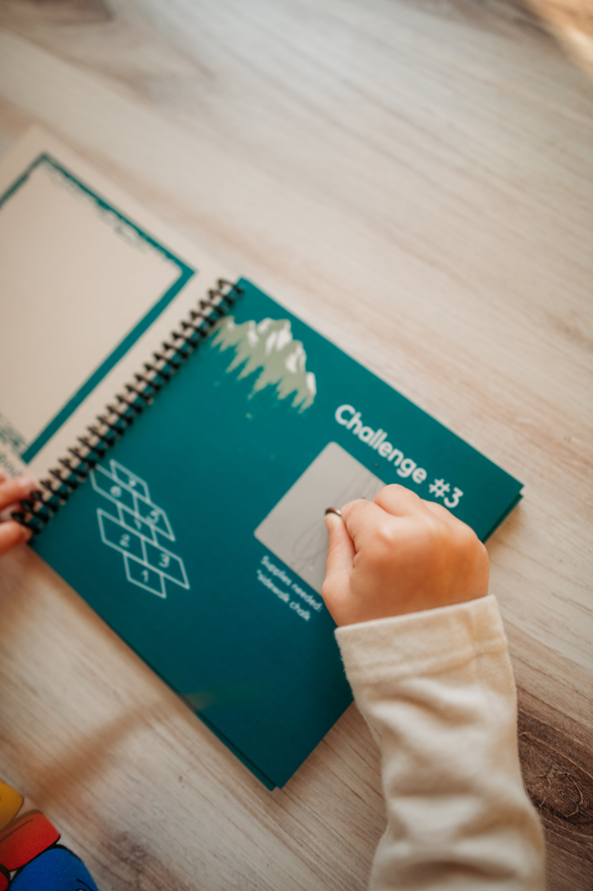 Simply scratch the scratch-off box to reveal the challenge for the day. The challenges can be done in any order and there is an image in the bottom left of each page that is a clue about the challenge. Most challenges can be done year round, but if there is a specific time/season, that is noted underneath the scratch box and it is also noted if there are any specific items needed for the challenge.